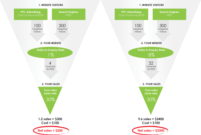 This example shows a business that provides a services at an average of $250 for it's clients. The first example on the left shows that their website has a visitor to enquiry rate of only 1%.